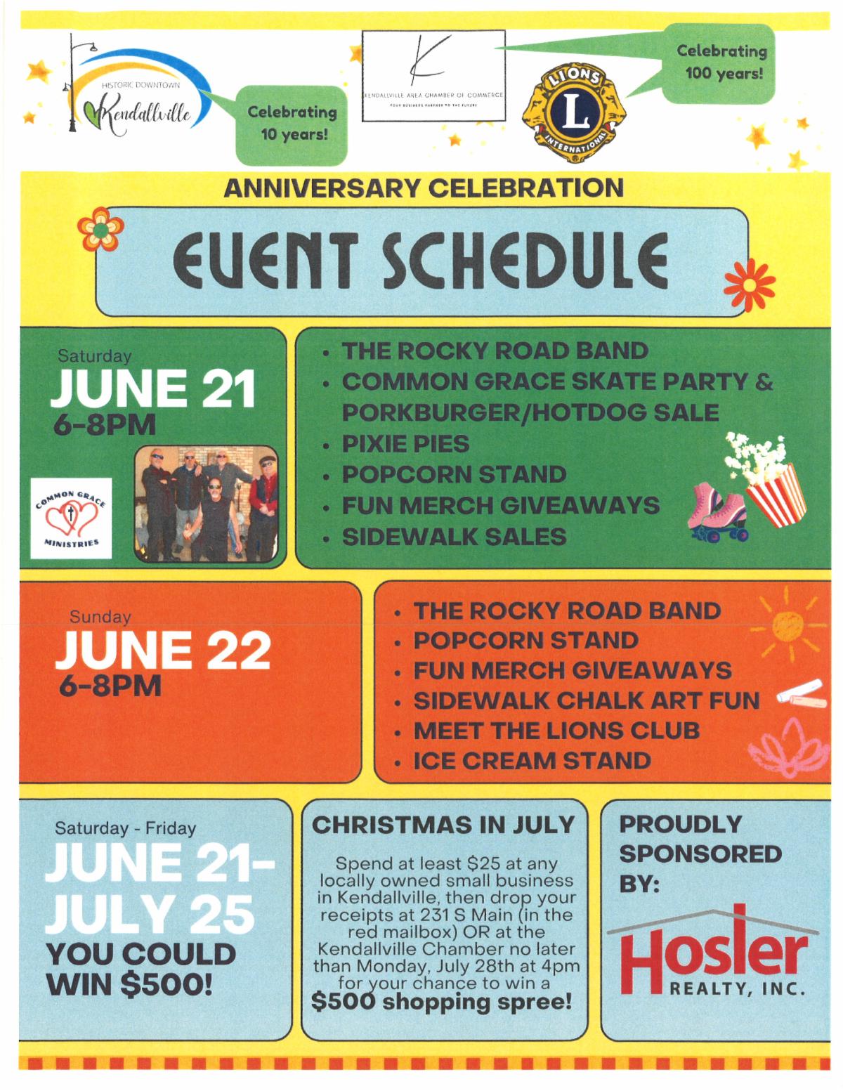 We're turning 100 years old and we want to celebrate with you! Join us on Friday, June 21st and Saturday, June 22nd from 6:00 - 8:00pm for an anniversary celebration! Our friends the Lions Club International also turns 100 and Historic Downtown Kendallville is turning 10! Music, giveaways, sidewalk sales, pixie pies, ice cream, and more await you. Run, don't walk, and join the fun!