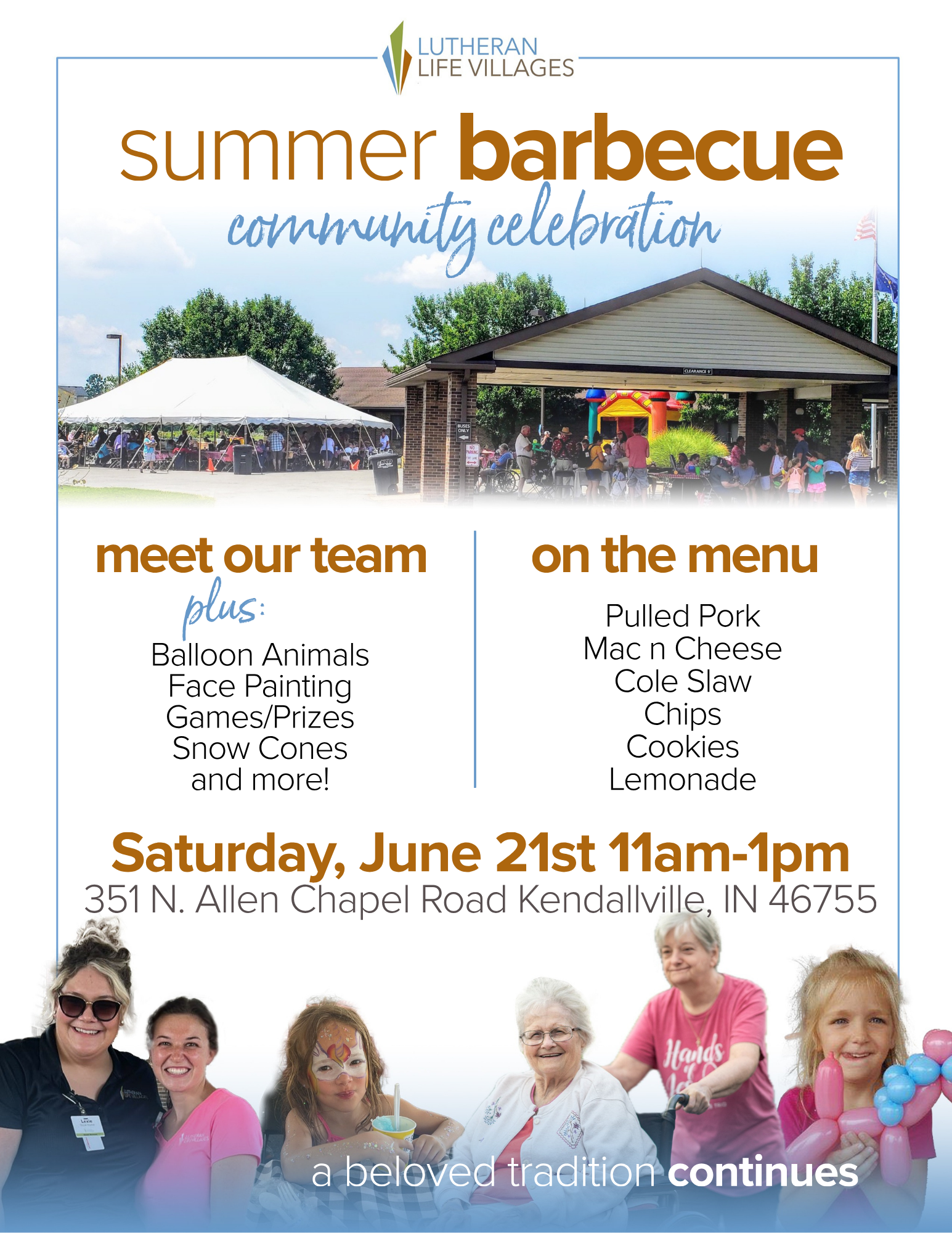 Join the team at Lutheran Life Villages for a community celebration on Saturday, June 21st from 11:00am - 1:00pm for a summer barbeque and family fun! This beloved tradition includes: pulled pork, mac n' cheese, cole slaw, chips, cookies, lemonade, balloon animals, face painting, games, snow cones, and more!
