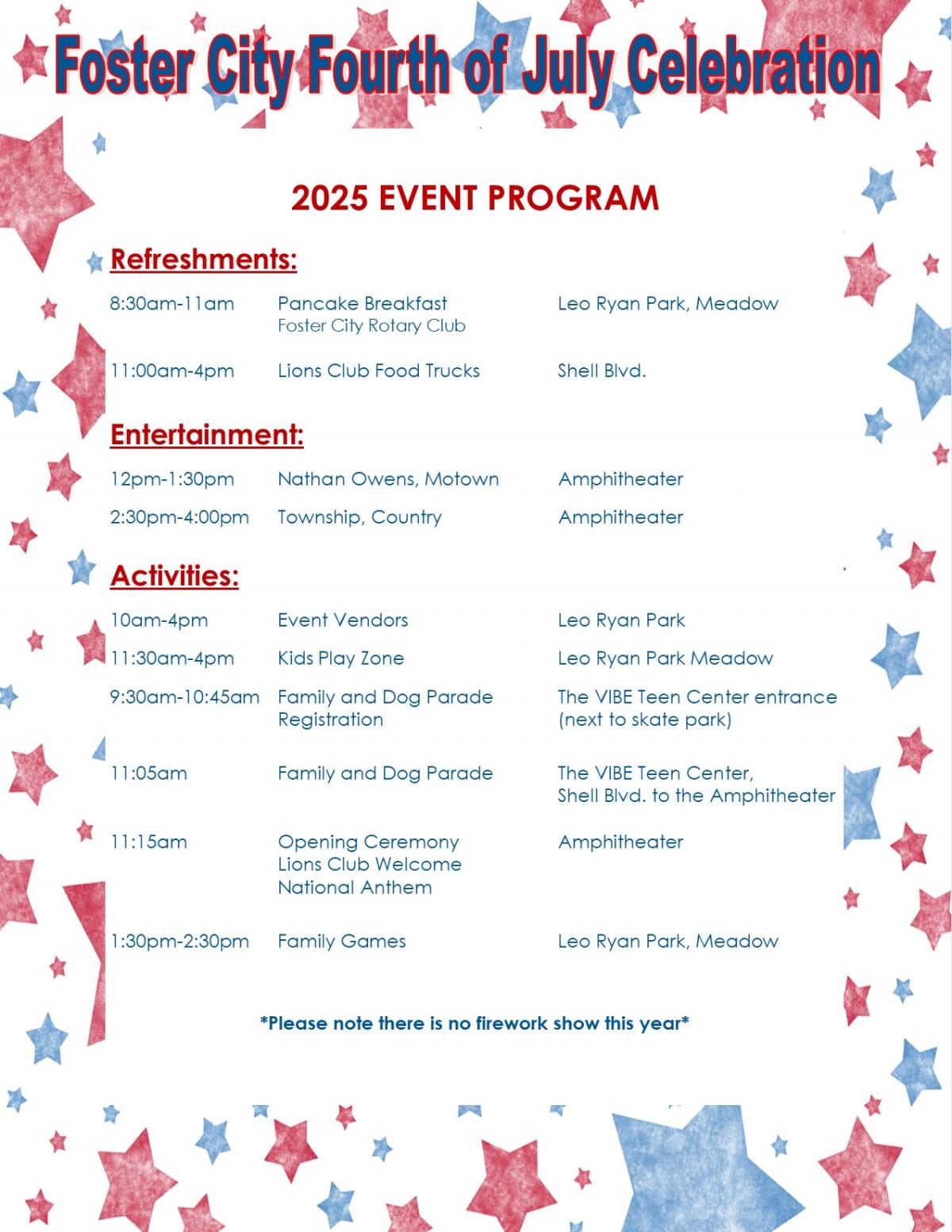 Join the Foster City Parks & Recreation, Lions of Foster City, Foster City Chamber, and the Foster City Rotary Club for this exciting all-day event on Friday, July 4, 2025 at Leo Ryan Park! You don't want to miss all the games, food, entertainment, and our annual family and dog parades.