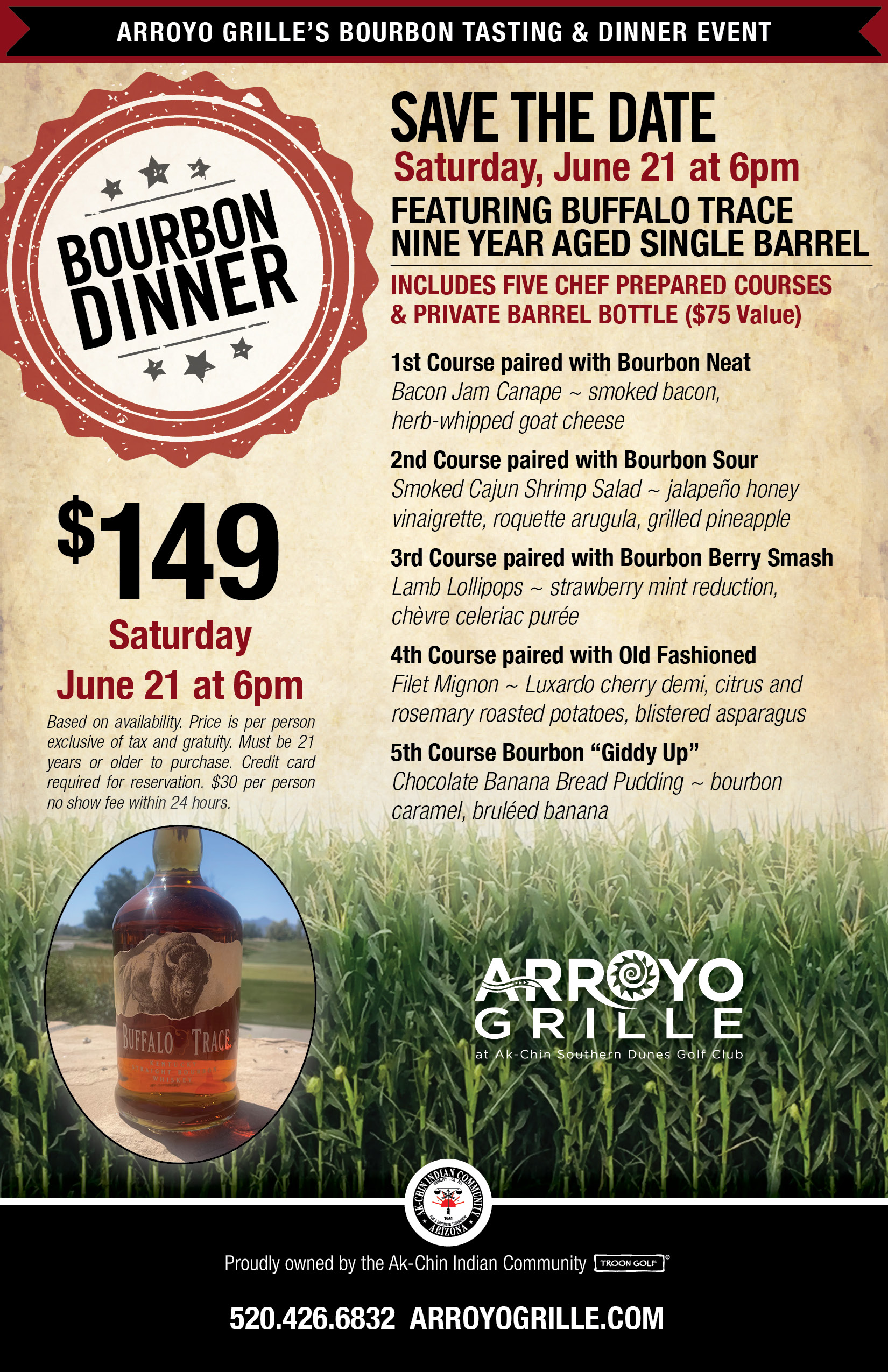$149 per person which includes a bottle of 9 year aged bourbon from buffalo trace facility. This is a one of a kind bottle of bourbon. Five courses are paired with five beverages, the bourbon knowledge of the general manager, Brady Wilson. You won't want to miss this event!