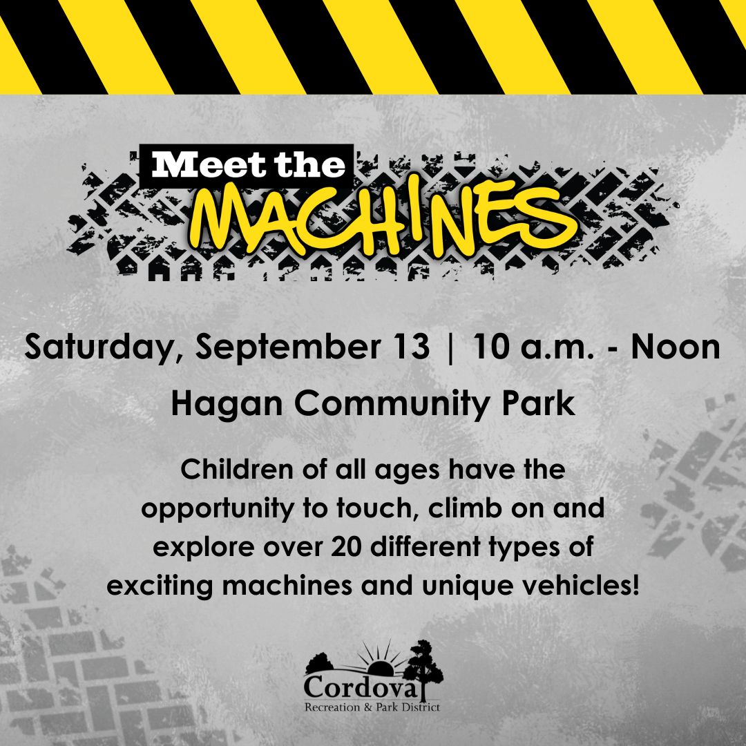 Join Cordova Recreation & Park District for their annual Meet the Machines event! Children of all ages have the opportunity to touch, climb on and explore over 20 different types of exciting machines and unique vehicles. The event will also feature child friendly activities such as giant slides, interactive games, music and more!
