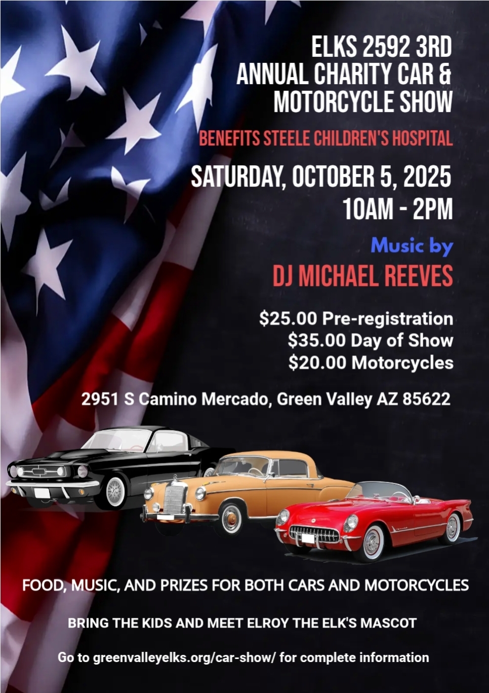Come out and enjoy the day at our 3rd Annual Charity Car and Motorcycle Show. Pre-registration is available at https://www.greenvalleyelks.org/car-show, and gates open at 9am.