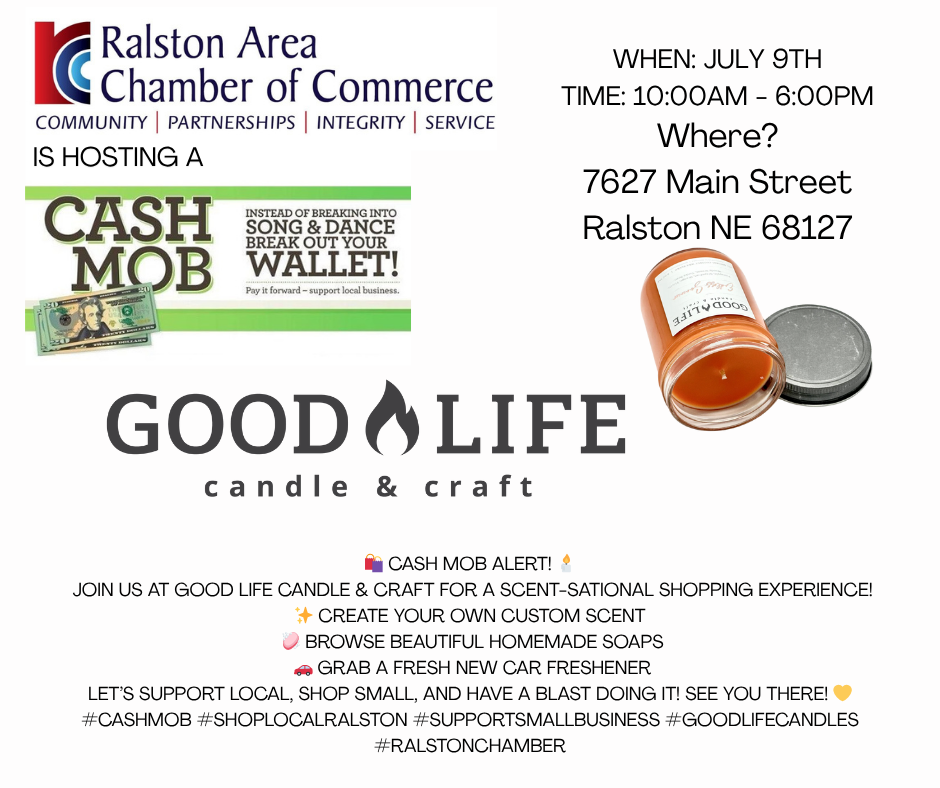 CASH MOB ALERT! Join us at Good Life Candle and Craft for a SCENT-SATIONAL shopping experience! Create your own custom scent! Browse Beautiful Homemade Soaps! Grab a Fresh New Car Freshener! Let's Bring Local Back, Shop Small and have a blast doing it! See you there!