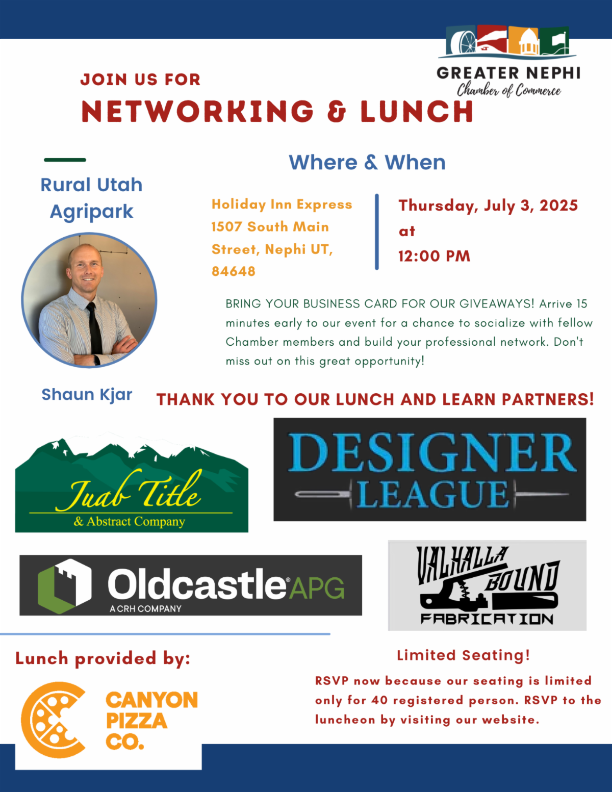 Calling all businesses!!!... Join us for our July Lunch and Learn this Thurs, July 3rd at the Nephi Holiday Inn from Noon-1pm. Our speaker, Shaun Kjar, will be sharing information focused on the exciting growth and development happening in the Central Utah Agripark. Lunch will be catered by Canyon Pizza Co.