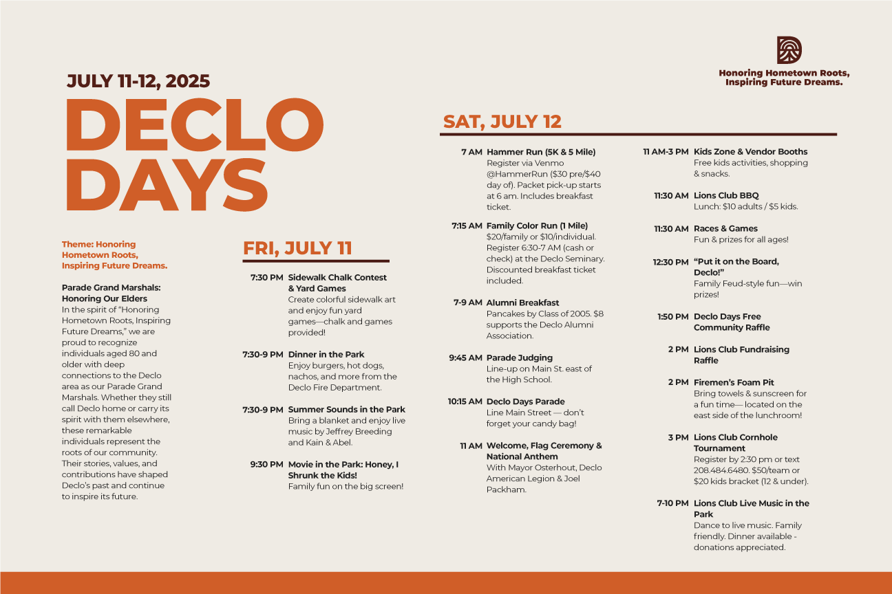 Declo Days is a fun-filled community celebration packed with activities for all ages! Enjoy entertainment, games, food, local vendors, a parade, and more as we come together to celebrate small-town pride and the spirit of Declo.