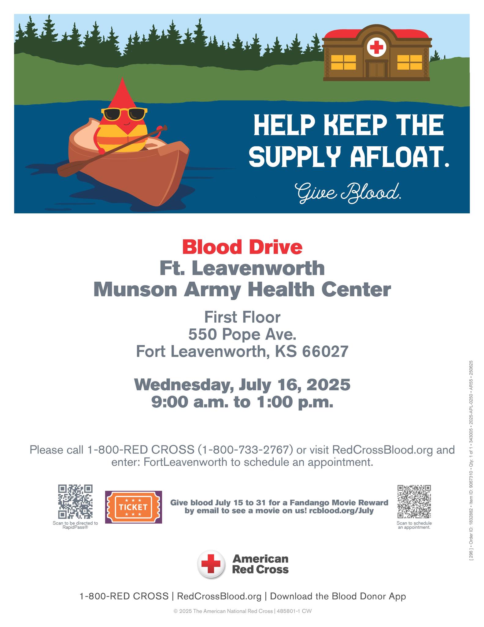 Please call 1800-733-2767 or visit RedCrossBlood.org and enter: FortLeavenworth to schedule an appointment.