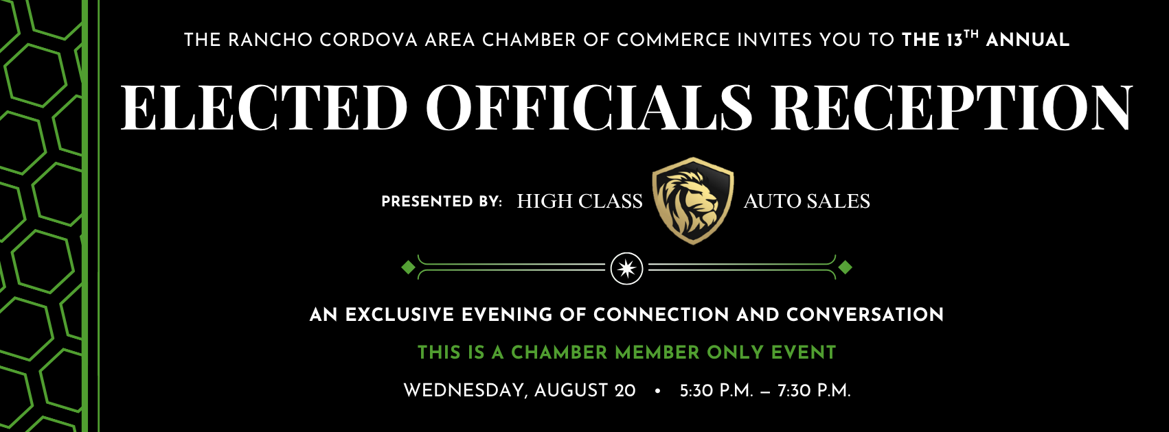 Sponsors of the 2025 Elected Officials Reception Title Sponsor:High Class Auto Sales Host Sponsors:AKT Development, Better Business Bureau of Northeast CA, Dignity Health, HMCI, & RADZ Presenting Sponsors:AT&T, Atlas Disposal, Elliott Homes, First Northern Bank, Goldenstone Wealth Management, Kaiser Permanente, KP International Market, North State Building Industry Association,P G & E, Sacramento Marriott Rancho Cordova, SMUD, Sutter Health, & Visit Rancho Cordova Executive Sponsors:California American Water, Golden State Water Company, Hyatt Place, Murphy Austin Adams Schoenfeld, & Woodside Homes Official Sponsors:Residence Inn & River Valley Community Bank Bar Sponsor: McIlwain Mobility Solutions, Inc