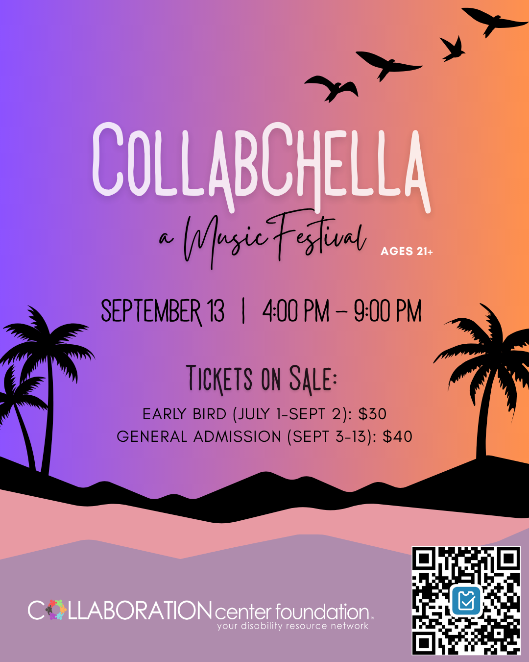 Attention music lovers! Get ready for Collaboration Center's first-ever indie music festival, CollabChella! For individuals 21+, this one-day event is designed for everyone and supports the Collaboration Center’s mission to amplify inclusion, independence and access to resources for Las Vegas’ disability community. Enjoy live performances from local bands, delicious food and drinks available for purchase, and a chance to connect with fellow festival-goers. Snag your pre-sale tickets for $30 per person (July 1 - September 2, 2025) or grab general admission tickets for $40 (September 3 - 13, 2025). The event runs from 4-9 PM, with doors opening at 3:30 PM for full venue access to all the musical action! All proceeds benefit Collaboration Center and its programs. Visit www.collablv.org/events/collabchella for more information and to purchase your tickets today.