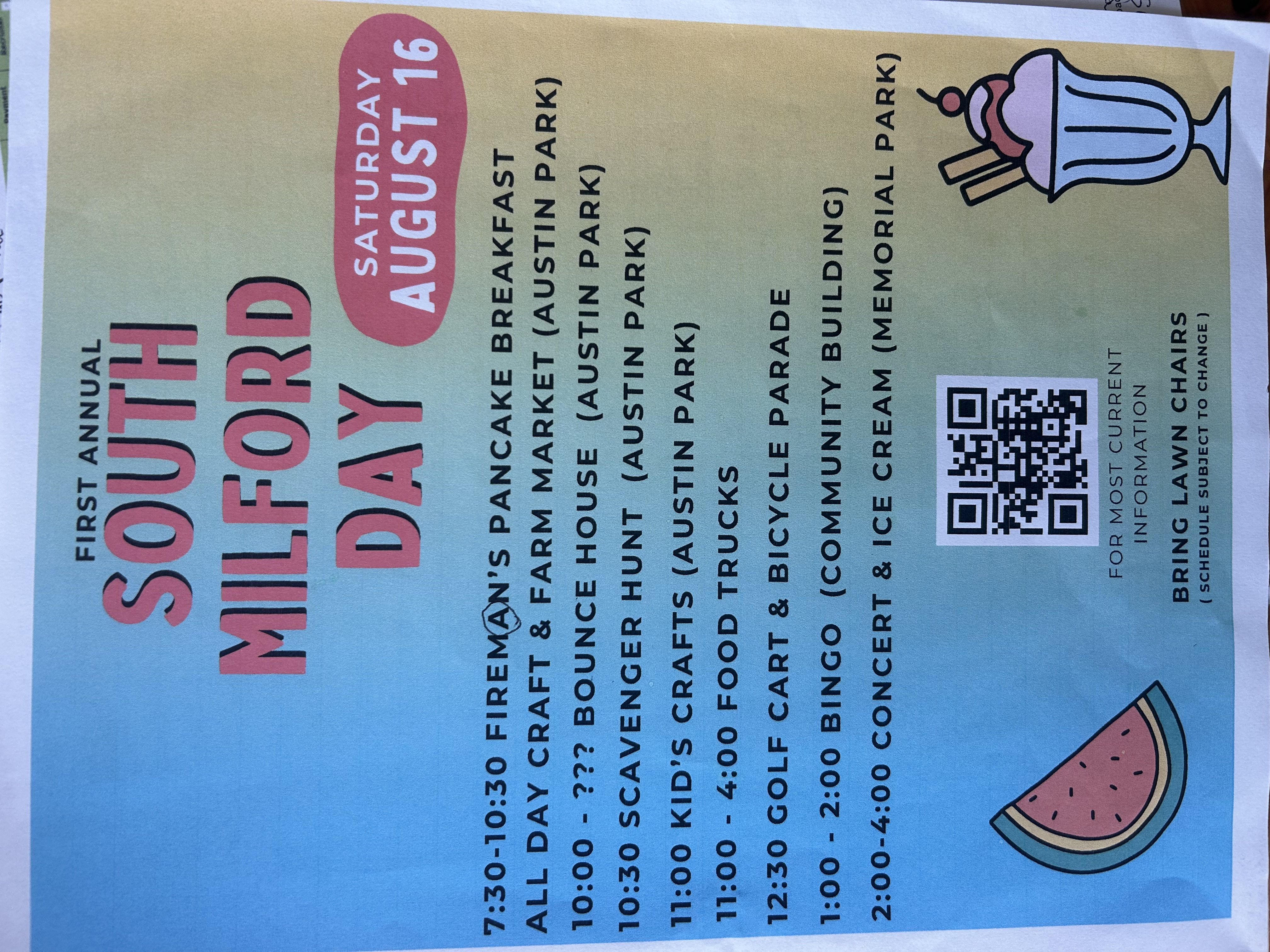 First annual South Milford Day starts with a pancake and sausage breakfast from 7:30 -10:30 am with a free will donation. Baked goods, produce and homemade crafts will be available for purchase at the pavilion in Austin Park Children's activities including a bounce house will be happening at Austin Park. Food trucks and area restaurants will have food to purchase. A free to enter golf cart parade will start at the community building at 12:30. Golf carts, 4 wheelers, bicycles,etc are welcome. Decorate yours and join in the fun. Bingo will be held in the Community building from 1-2pm. Bingo cards can be purchased for $1 each for the hour. That money will be used for prize money. Also, $1/ticket or $5/6 for a 50/50 drawing during that time will be sold. Pop and water will be available for purchase. The day will end with a concert in the park at the Veterans Memorial Park from 2-4pm with root beer floats available for purchase. A flyer on the South Milford Community League Facebook page lists the day's activities. Please, come celebrate South Milford with us.