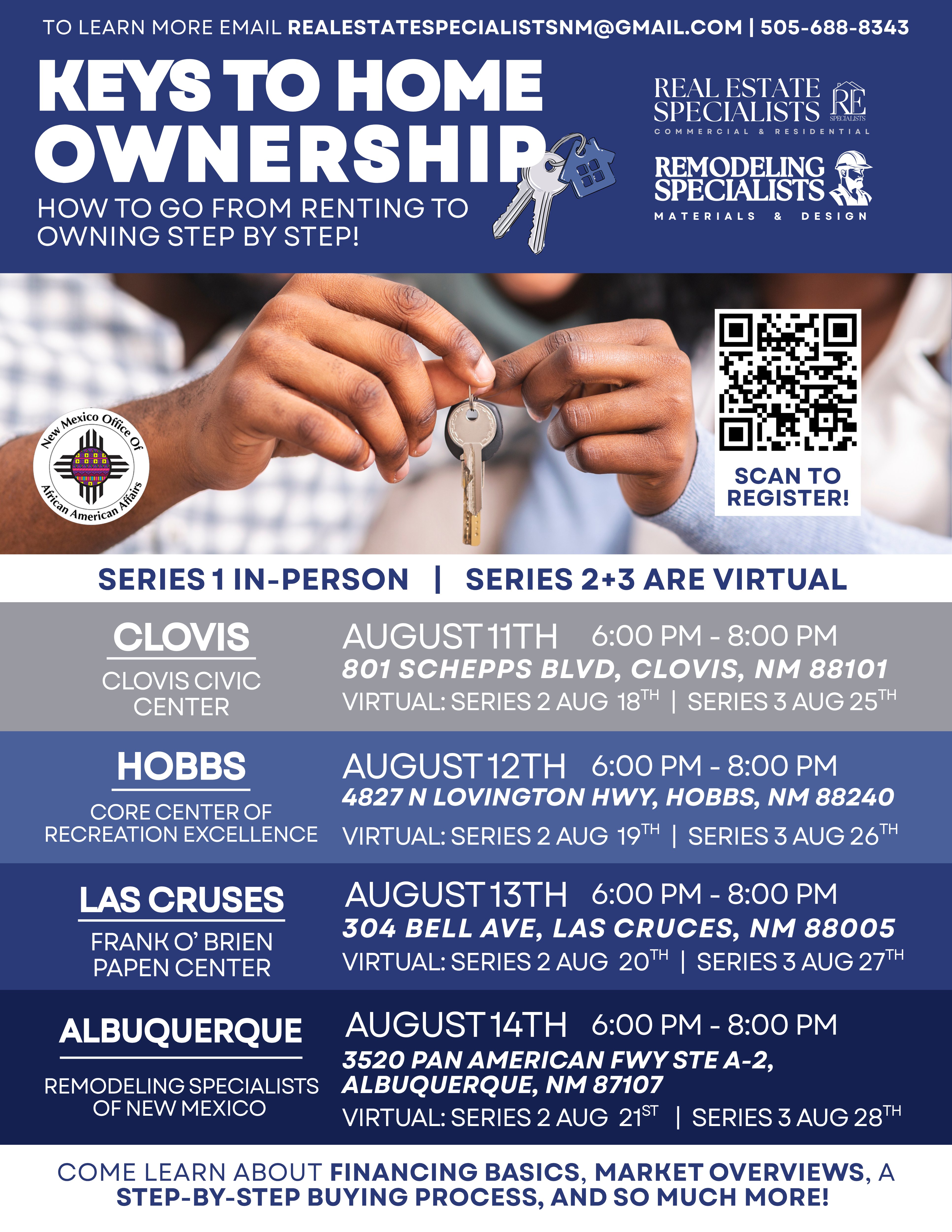 This free workshop is hosted by Real Estate Specialists and includes expert insights, buyer checklists, and practical tips tailored for New Mexico residents. Attendees will leave with a full roadmap to buying their first home—plus free resources and Q&A time with licensed real estate professionals