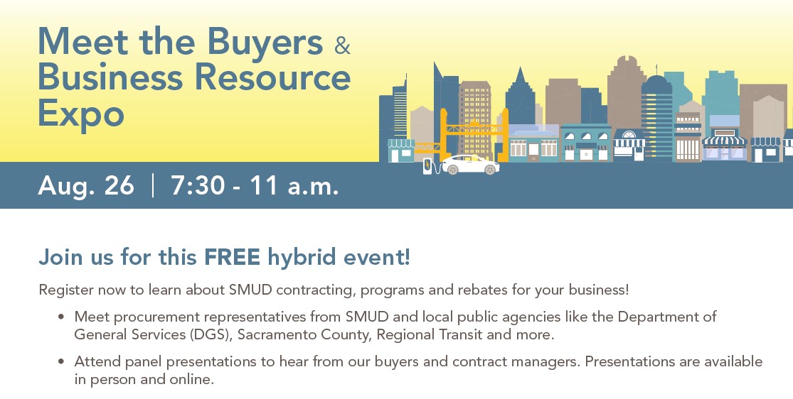 Join us for this FREE hybrid event! Register now to learn about SMUD contracting, programs and rebates for your business! • Meet procurement representatives from SMUD and local public agencies like the Department of General Services (DGS), Sacramento County, Regional Transit and more. • Attend panel presentations to hear from our buyers and contract managers. Presentations are available in person and online.