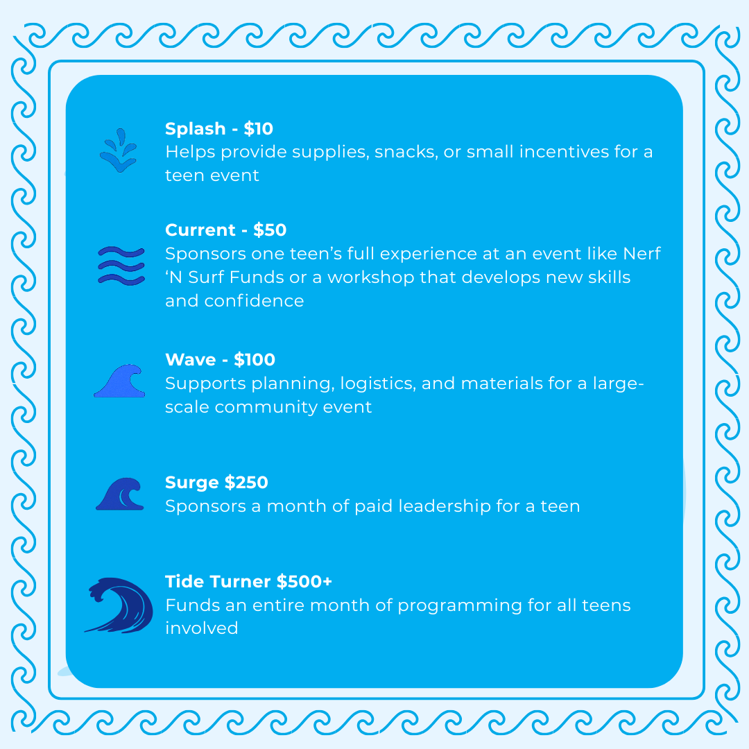 Sponsors one teen’s full experience at an event like Nerf ‘N Surf Funds or a workshop that develops new skills and confidence