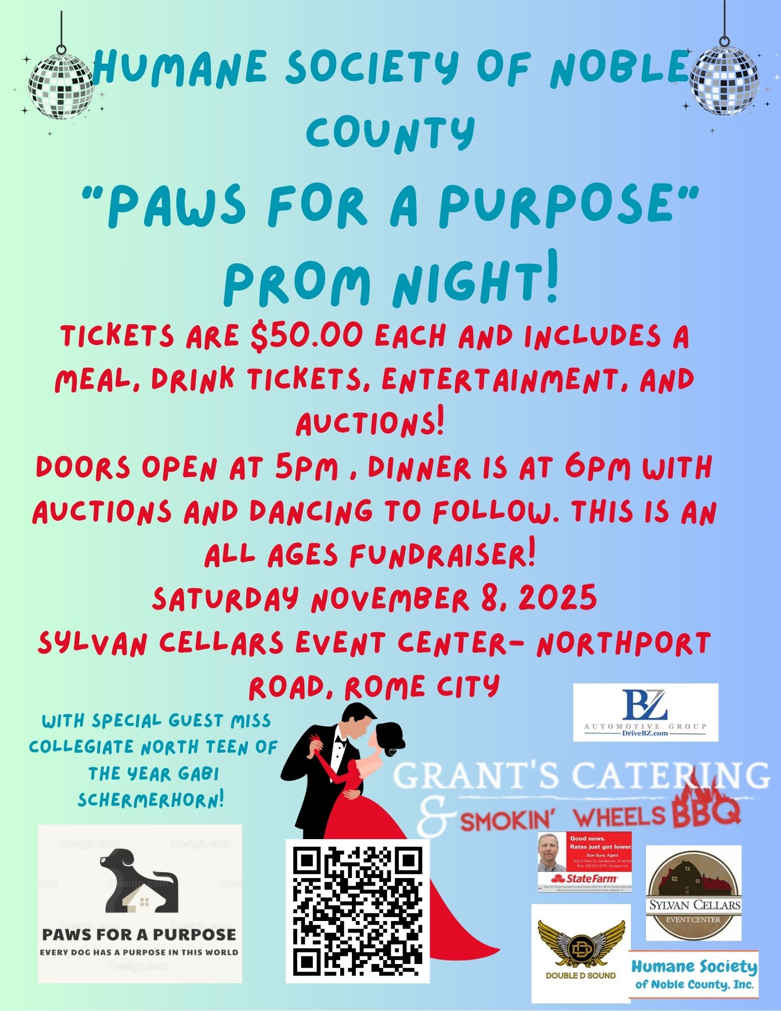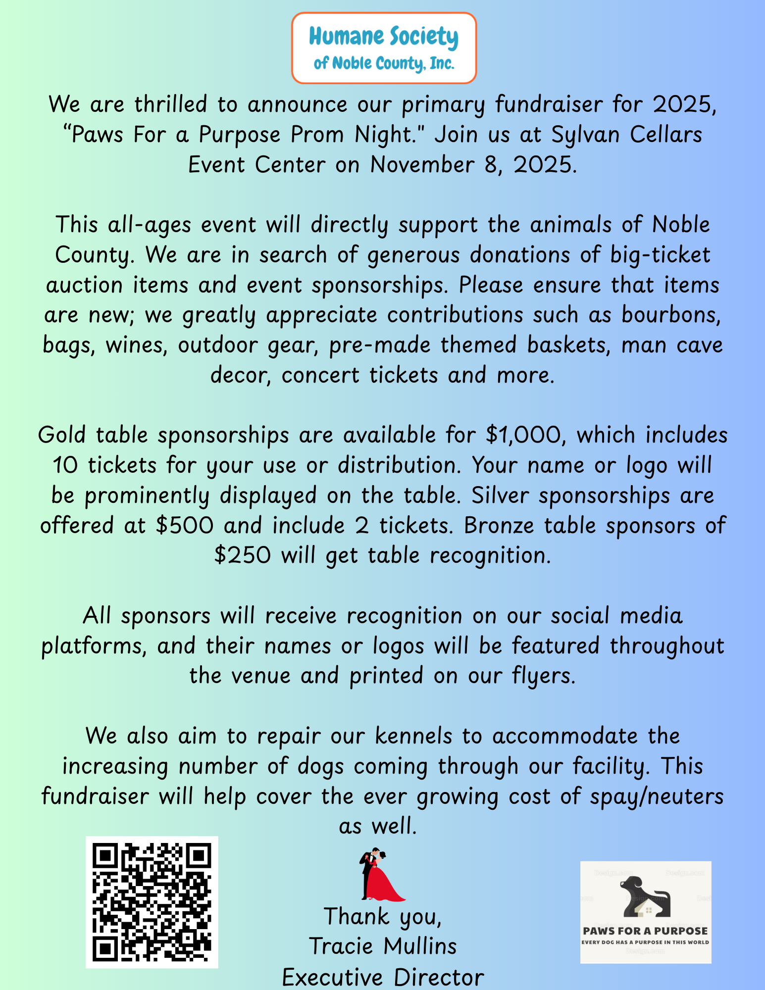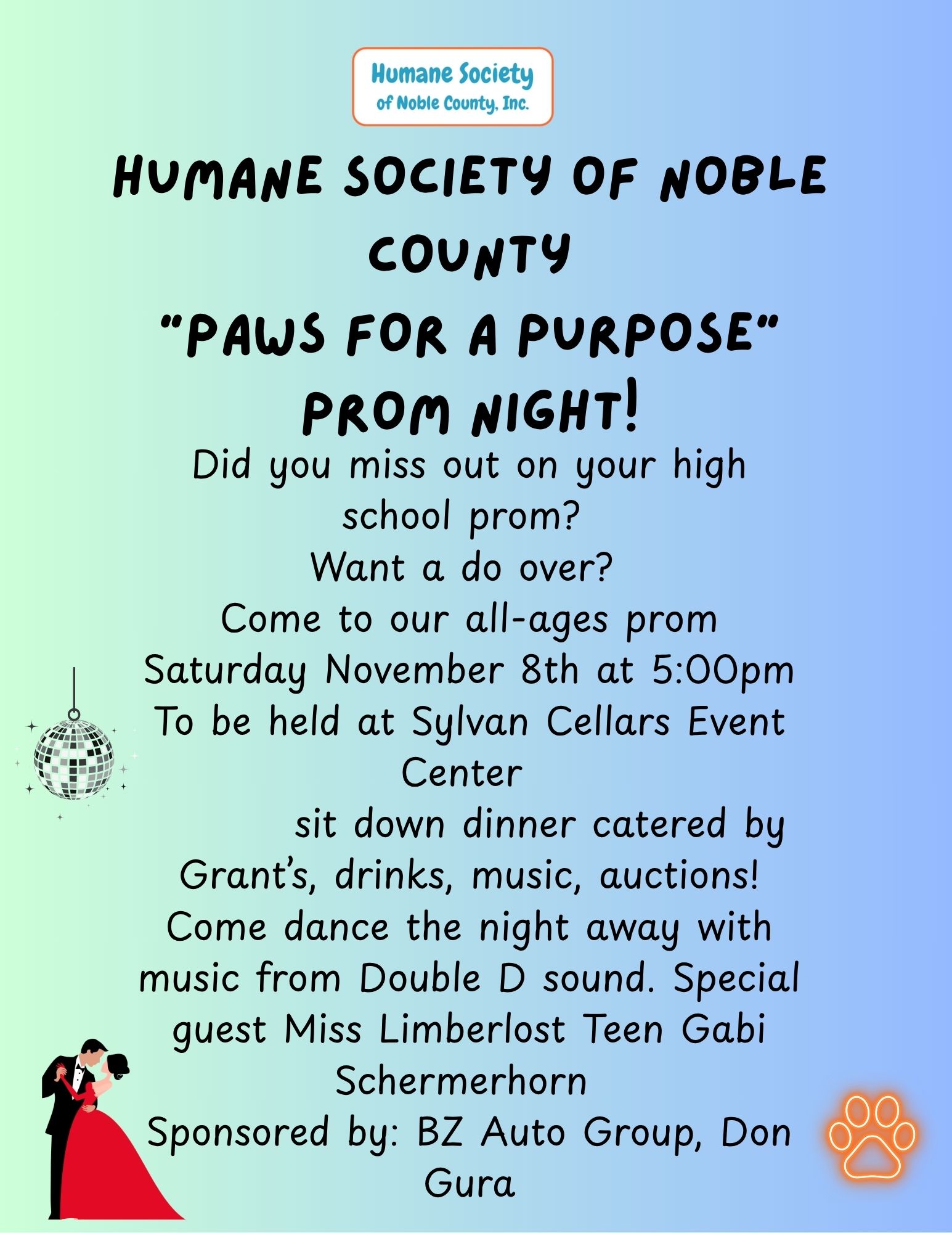 A fun night of food, drinks, music, auctions all benefiting the animals of Noble County. Sponsorships are available from $250 to $1,000 with options of table recognition and tickets to the event. Proceeds from this fundraiser event will be used to helprepair kennels to accommodate the increasing number of dogs entering the facility and the ever growing cost of spaying and neutering animals.