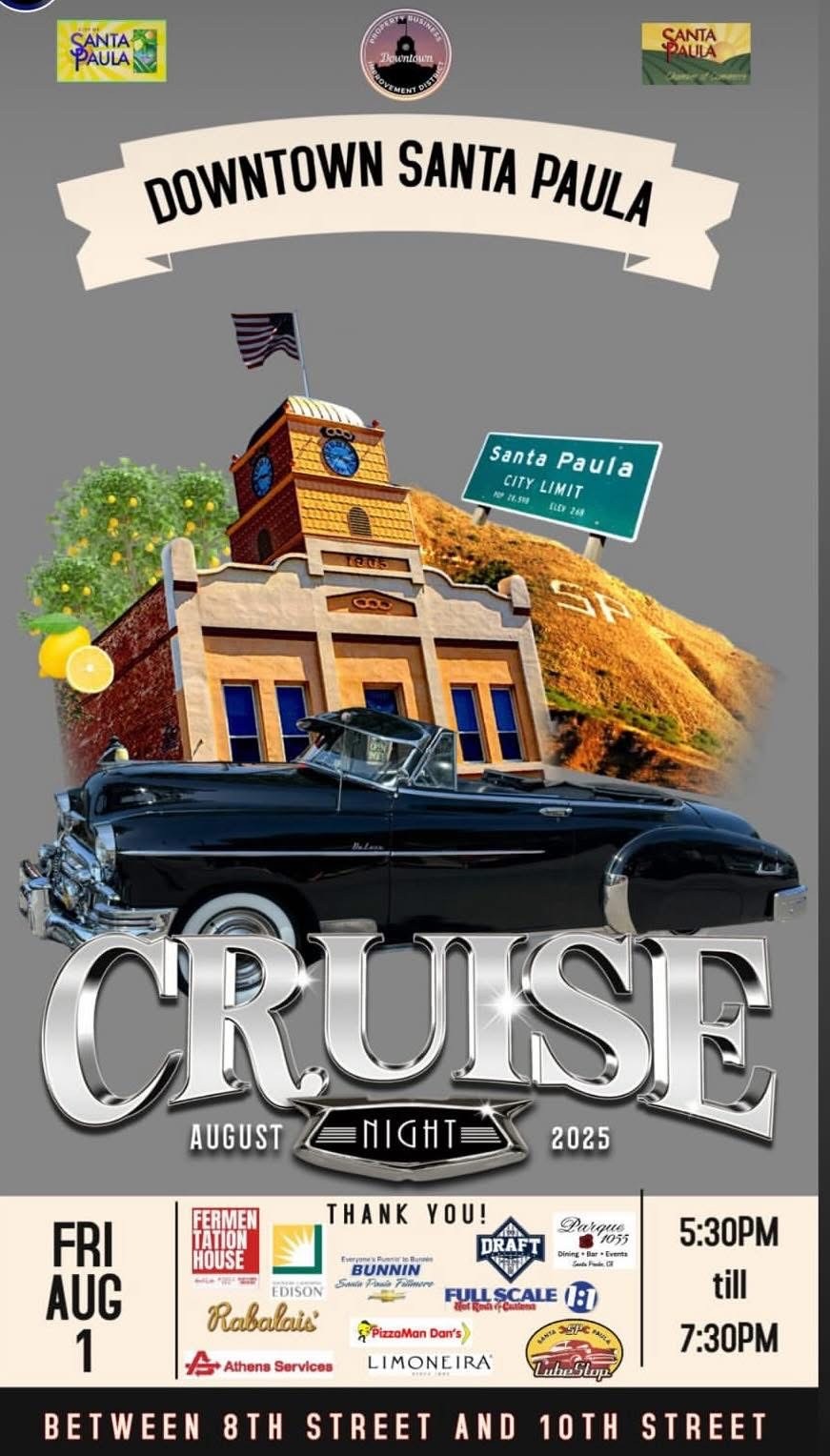 Join us for the Downtown Santa Paula Cruise Night – a community favorite celebrating classic cars, local flavor, and summer vibes!