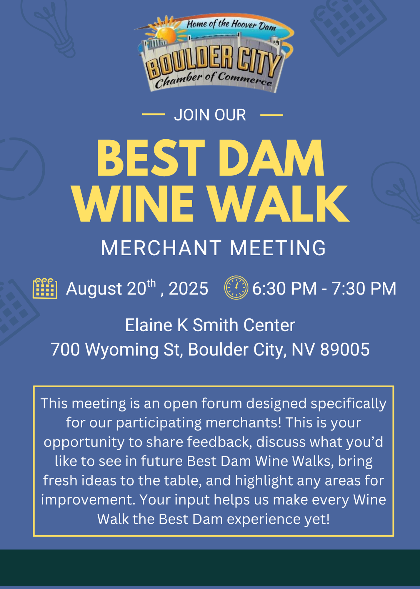 We’d like to invite you to our upcoming Best Dam Wine Walk Merchant Meeting, created specifically for our participating businesses. Your feedback and input are incredibly valuable as we work to make each Wine Walk an even better experience for everyone involved.