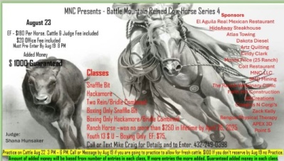 Mark your calendars for Battle Mountain Reined Cow Horse Series 4. Guaranteed $1000 Added. Added money will be divided accordingly to the number of entries in each class. Every class will have guaranteed added money. Must Pre-Enter by Aug 19, 8 PM. If you plan on practicing on fresh cattle, you must let me know by the closing date Aug 19 8 PM. Judge Shana Hunsaker