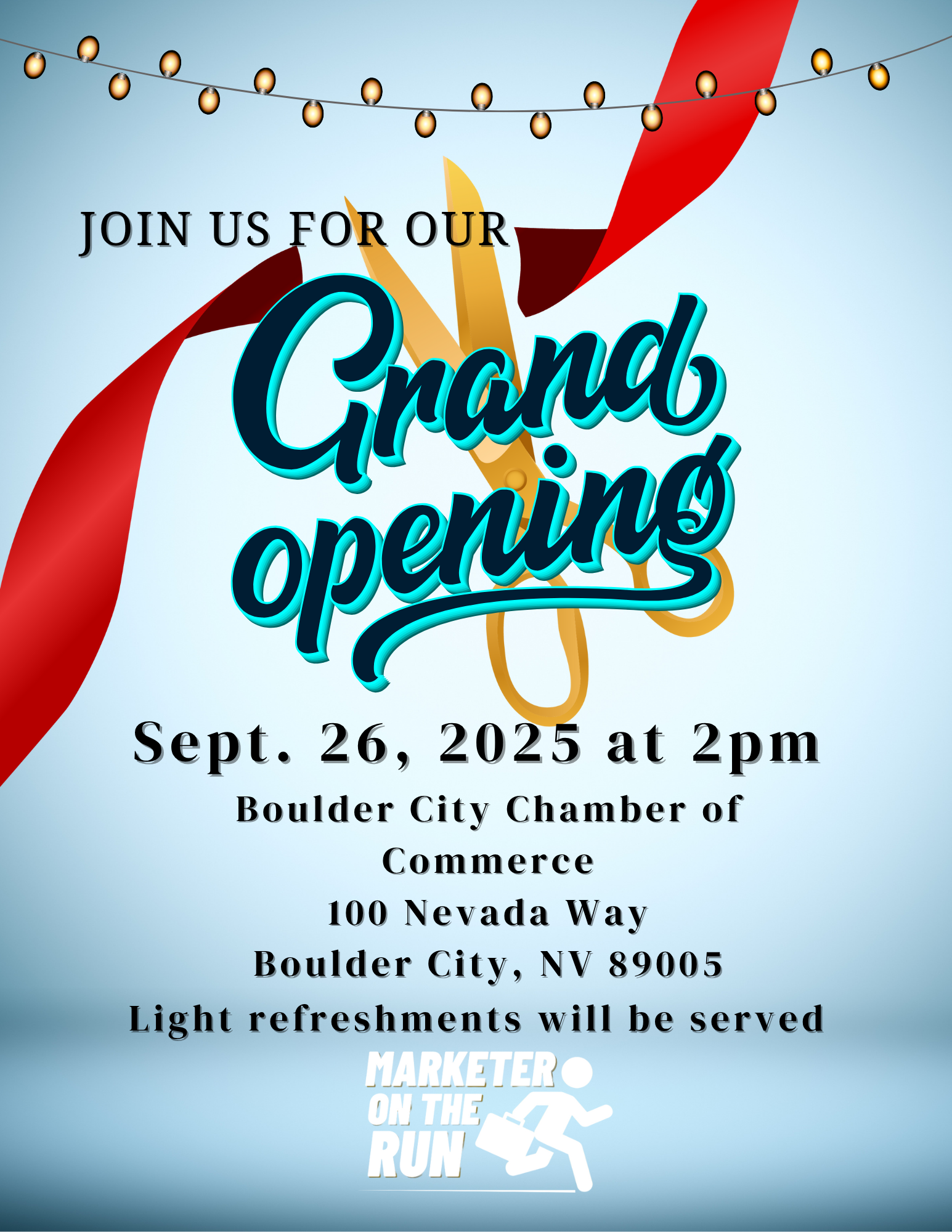 Come join us for the grand opening of Marketer on the Run! We're celebrating with a ribbon cutting ceremony at the Boulder City Chamber of Commerce. Meet the team, network with local professionals, and enjoy some refreshments. Don't miss out on this exciting event!