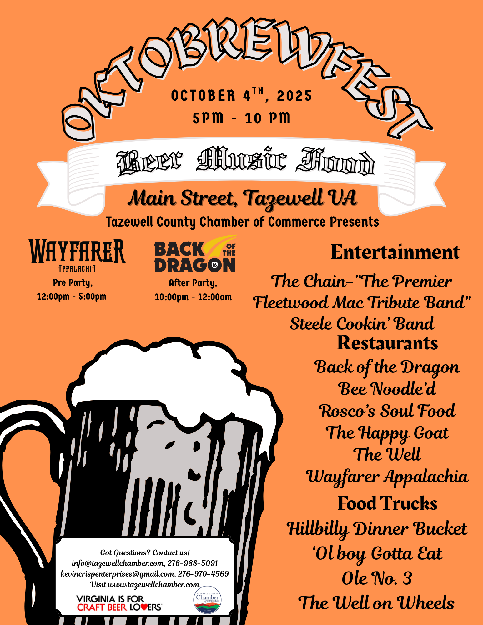 We’re excited to feature the region’s finest breweries, wineries, and cideries, plus popular food trucks and Main Street’s exceptional dining options. We have an amazing line up of bands as well--The Chain, a Fleetwood Mac tribute band, and our own Steele Cookin'.