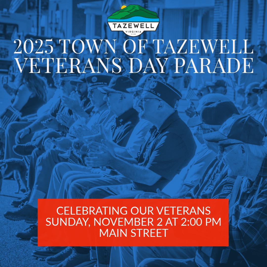 Hosted by Tazewell Today. The parade will start at Tazewell High School and will end on Main Street. Line-up will start at 12:30 p.m., the parade will begin at 2:00 p..m. Once the parade arrives on Main Street there will be program to honor our Veterans. Main Street will be closed for the event.