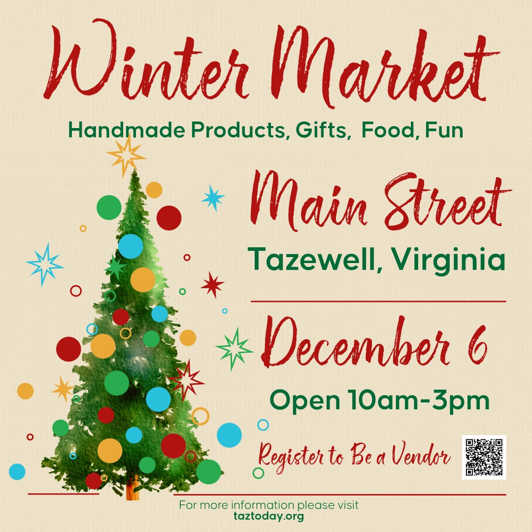 It’s the perfect way to kick off the Christmas season in downtown Tazewell. Apply now to be a vendor! https://www.taztoday.org/winter-market #TazToday#TazVA#WinterMarket#ShopSmall#ChristmasInTazVA#HolidayMarket