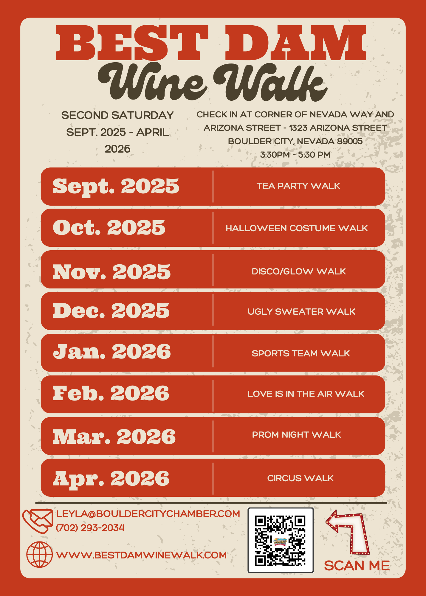 Ticket registration for the Best Dam Wine Walk is now open! Join us from September through April for an evening of strolling through Boulder City’s Historic District, enjoying wine, and exploring our local businesses.