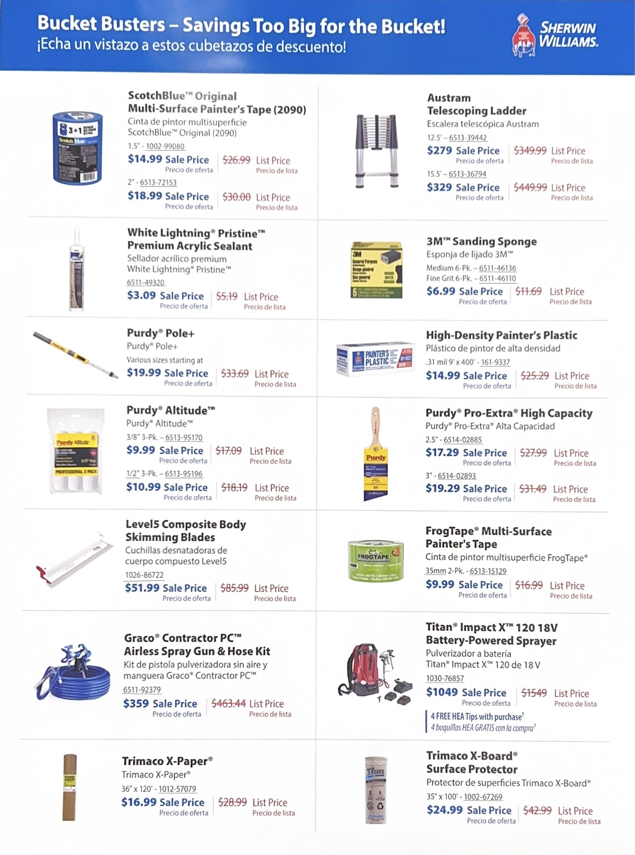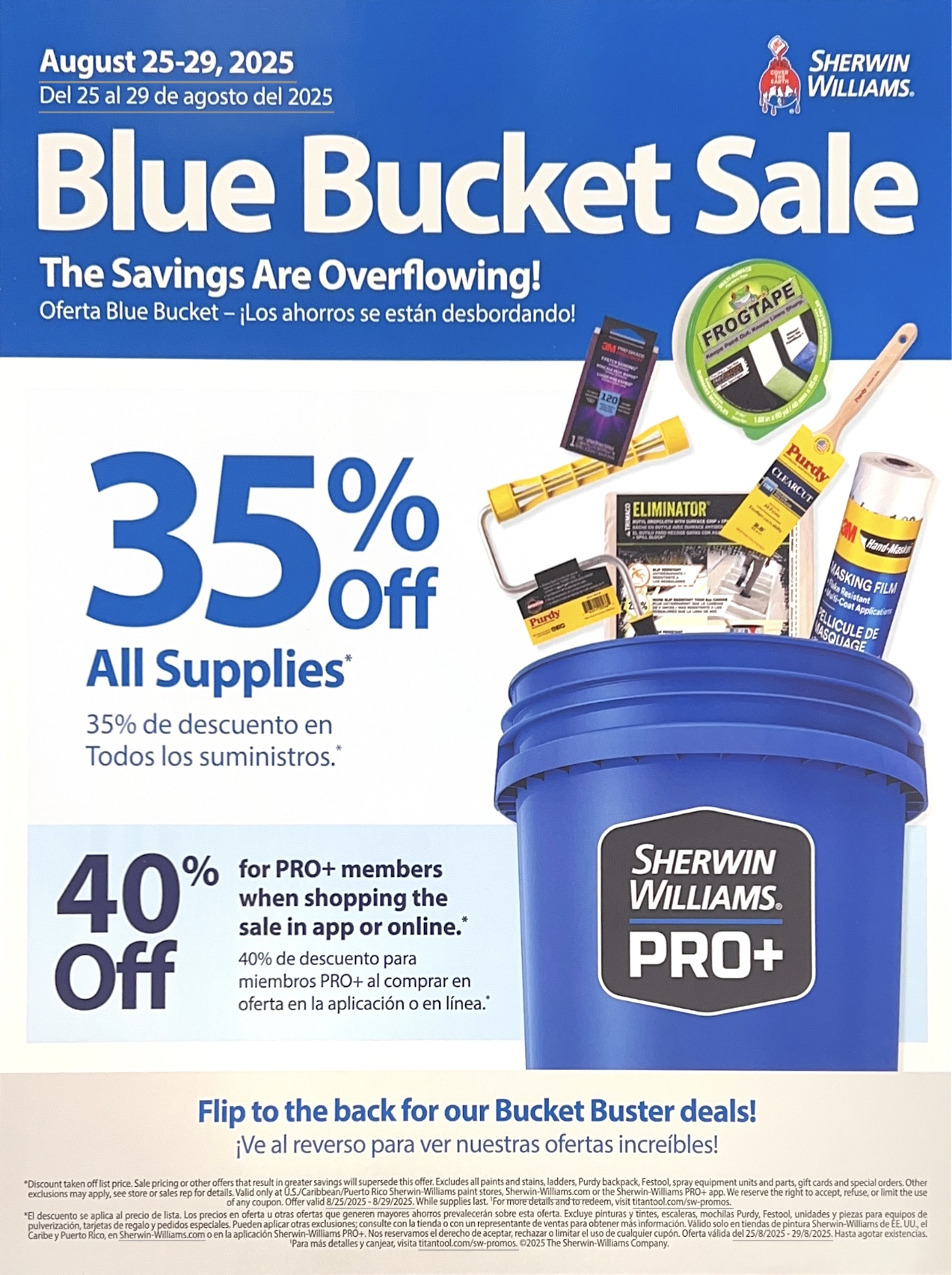 Snacks and refreshments for everyone who stops by, and customers with commercial accounts will get 35% off paint supplies for their Blue Bucket sale (see flyer for details): Blue Bucket Sale Flyer page 1; Blue Bucket Sale Flyer page 2