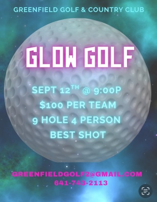 The Greenfield Golf & Country Club will be hosting Glow Golf. The Best Shot 9 hole tournament will begin at 9:00 pm. Entry fee is $100 for 4 person team.