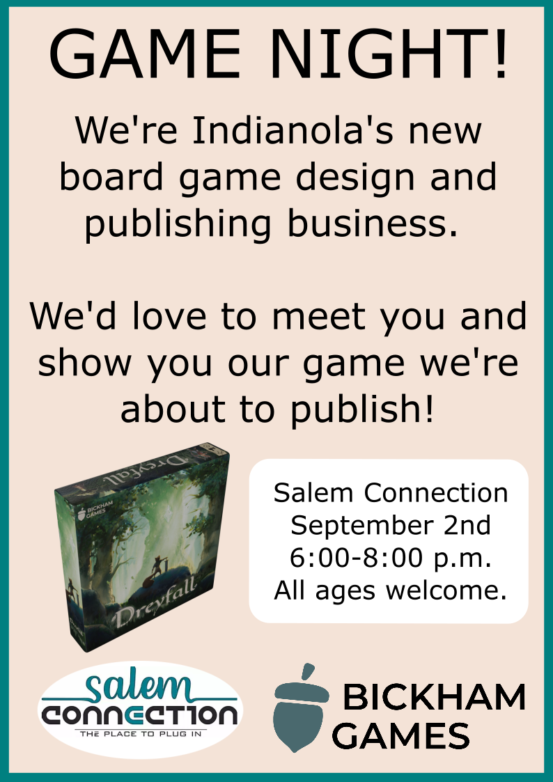 Come meet the owners of Bickham Games and try out our new board game! We're a new Indianola board game design and publishing business. We're launching our first game soon and we want to share it with Indianola! Come have a good time playing games with friends! Hosted by the Salem Connection on Tuesday, September 2nd from 6:00 to 8:00 p.m. Learn more about our business at our website.