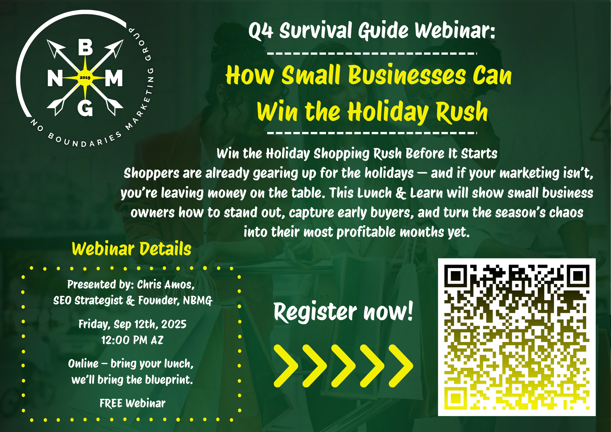 This Lunch & Learn is designed specifically for small business owners who want to cut through the seasonal noise and turn the busiest shopping months of the year into their most profitable. Join Chris Amos, CEO of No Boundaries Marketing, on Friday, September 12 at 12:00 pm AZ, as he walks you step-by-step through a real-world holiday marketing game plan tailored for small businesses.