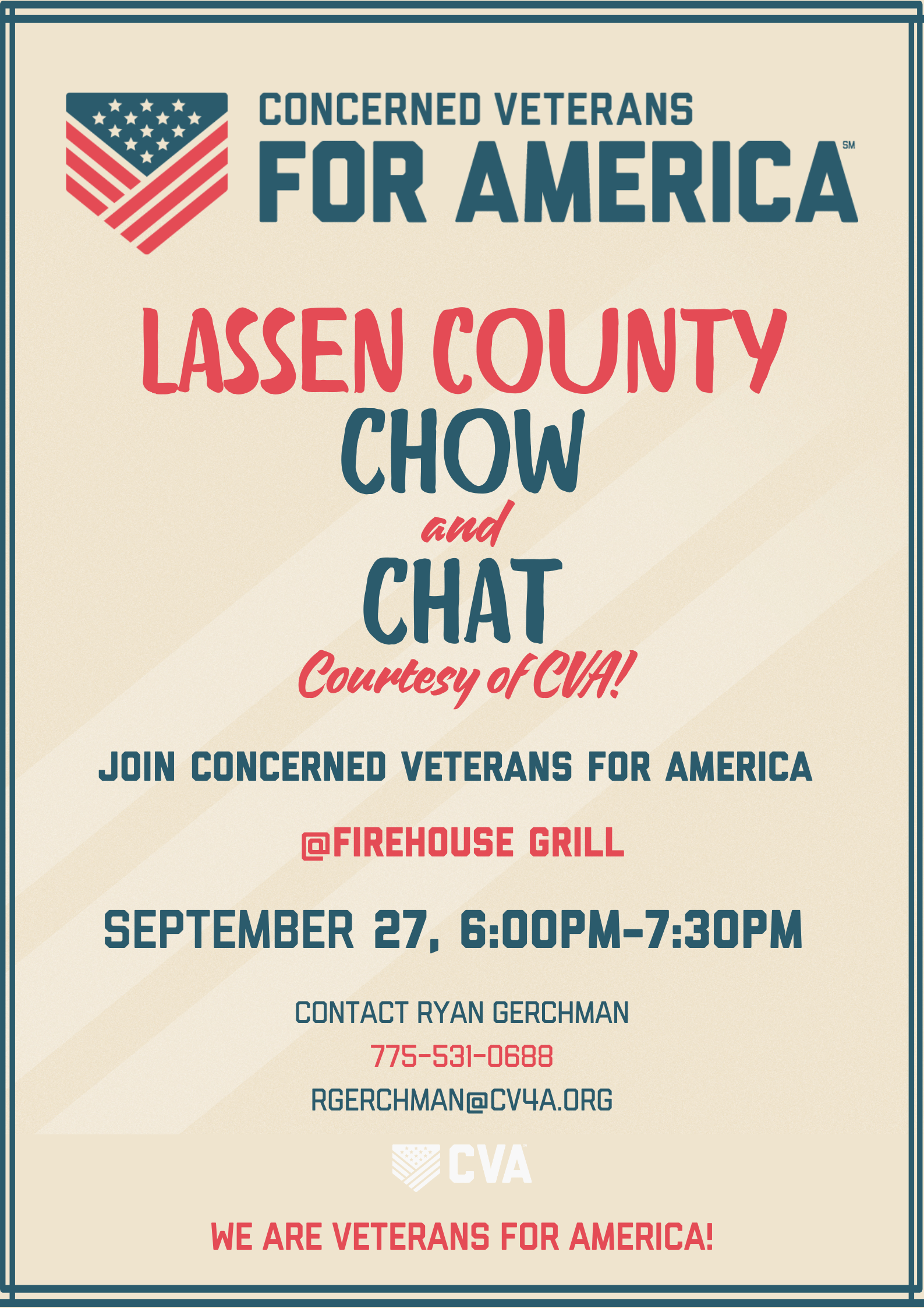 Join us for an evening of getting to know each other and learning more about Concerned Veterans for America (CVA) alongside Lassen County Veterans, Veteran Family Members, and Veteran Supporters!