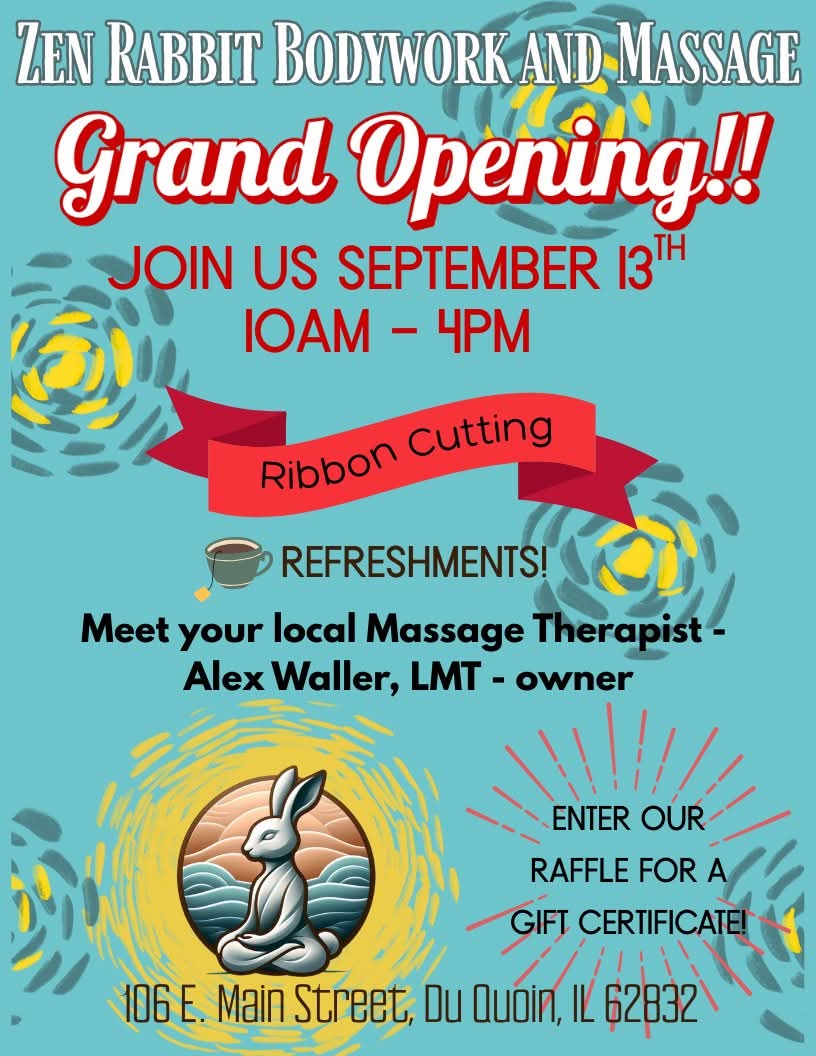 Grand opening of Zen Rabbit Bodywork and Massage office. Meet owner and massage therapist Alex Waller LMT, check out the office while enjoying refreshments and register for a free 60 minute Massage. Alex will answer any questions you may have about massage therapy and its benefits.