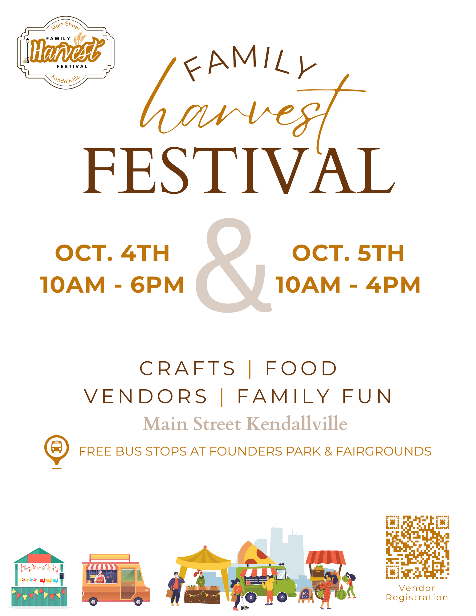 Don’t miss your chance to be part of Kendallville’s busiest fall weekend — apply today and be part of the **Family Harvest Festival magic!**