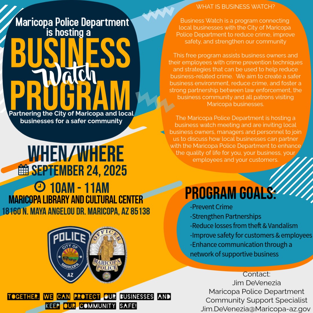 The Maricopa Police Department is hosting a Business Watch Program that is connecting local businesses with the City of Maricopa Police Department to reduce crime, improve safety, and strengthen our community.