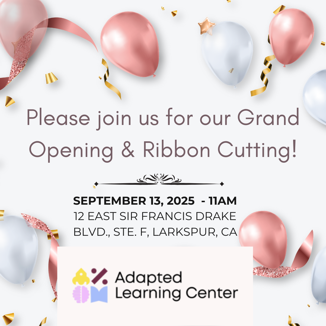 Please join us on Saturday, September 13th at 11am for a Ribbon Cutting to mark the official opening of the new Adapted Learning Center in Larkspur ! Please email caroline@adaptedlearningcenter.com to let us know you can make it! Hope to see you there!
