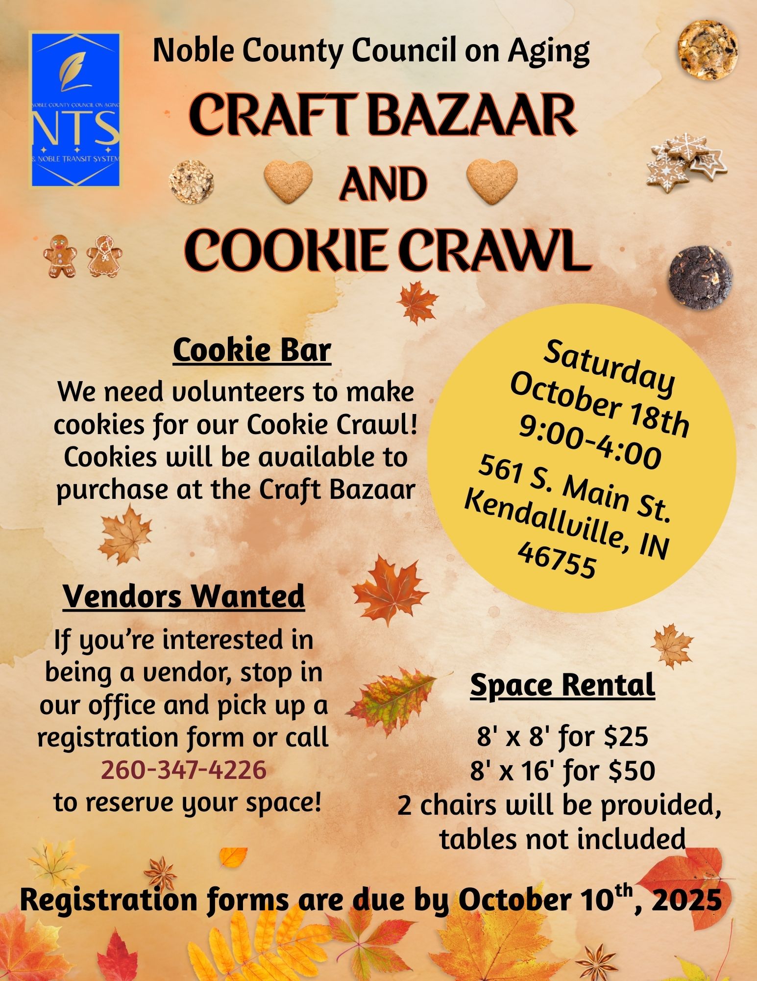Attention Bakers and Vendors, we invite you to join in the fun of our cookie crawl and craft bazaar on October 18th! Showcase your baking skills, as well as your crafting skills! This is going to be a wonderful event!
