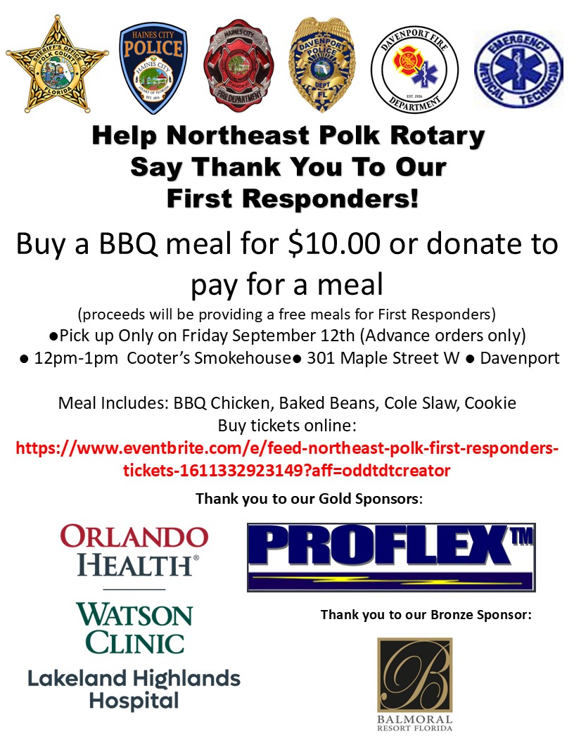 Northeast Polk Rotary's Thank Our First Responders Meal - Friday, September 12th, 12 - 1 p.m., Cooter's Smokehouse, 301 Maple Street W, Davenport, FL.