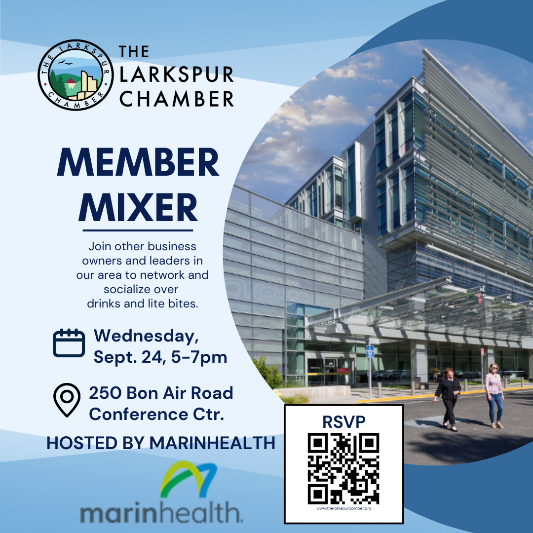 The Larkspur Chamber is delighted to announce our September Member Mixer at MarinHealth on Wednesday, Sept 24th from 5-7pm!Join us to mix and mingle over refreshments and light bites, including vegetarian options.