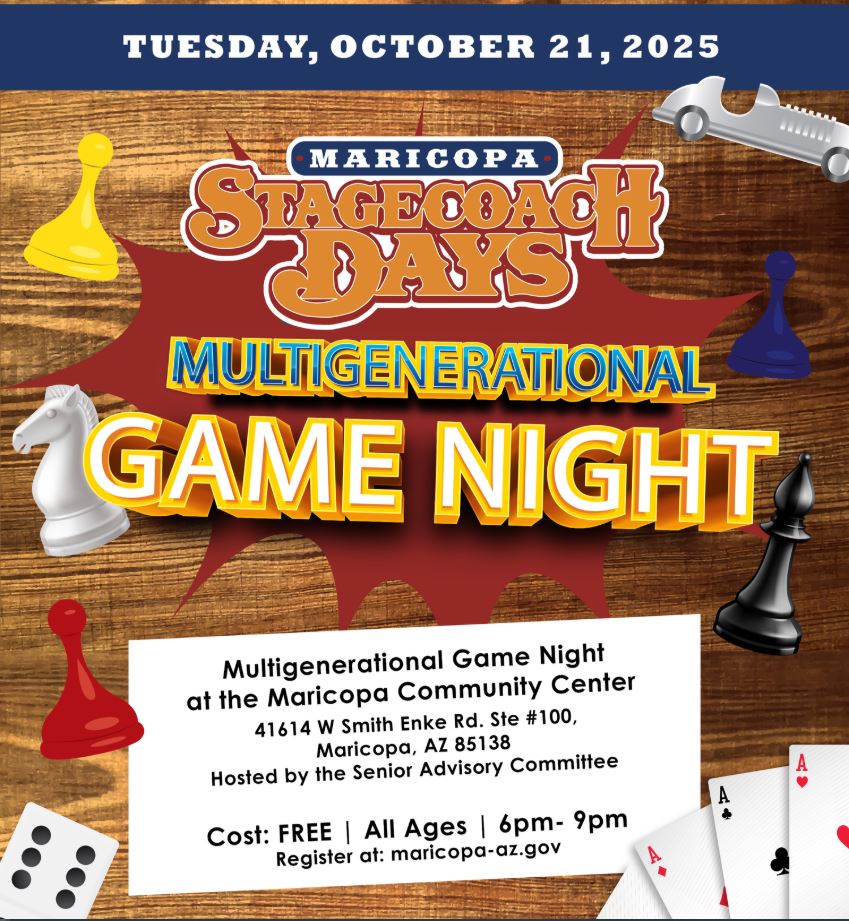 Get ready for a night of family fun at Multigenerational Game Night on Tuesday, October 21st from 6–9 PM at the Maricopa Community Center! This free event is open to all ages and brings together the community for classic board games, card games, video games, group challenges, and friendly competition. Whether you’re a seasoned game pro or just looking for a night of laughter and connection, there’s something for everyone. Registration is free and can be completed at https://anc.apm.activecommunities.com/cityofmaricoparec/activity/search/detail/26265?onlineSiteId=0&from_original_cui=true.