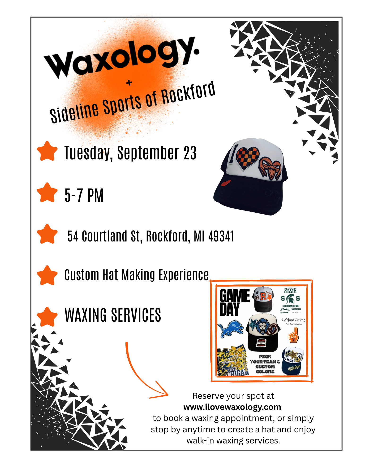 Waxology is teaming up with Sideline Sports of Rockford for a fun custom hat making event! Sideline Sports will be at Waxology to help make an amazing one-of-a-kind hat perfect to represent your favorite sport or your favorite things. No appointment needed for the Hat bar.