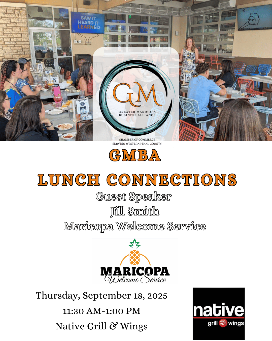 GMBA Lunch Connections Speaker will be the "Jill Smith" with "Maricopa Welcome Center".