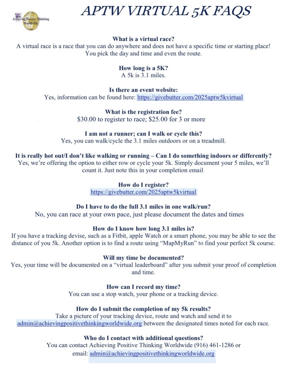 Register: Sign up for the "Lace Up - Celebrate Positive Thinking" APTW Virtual 5K on or before August 31, 2025.