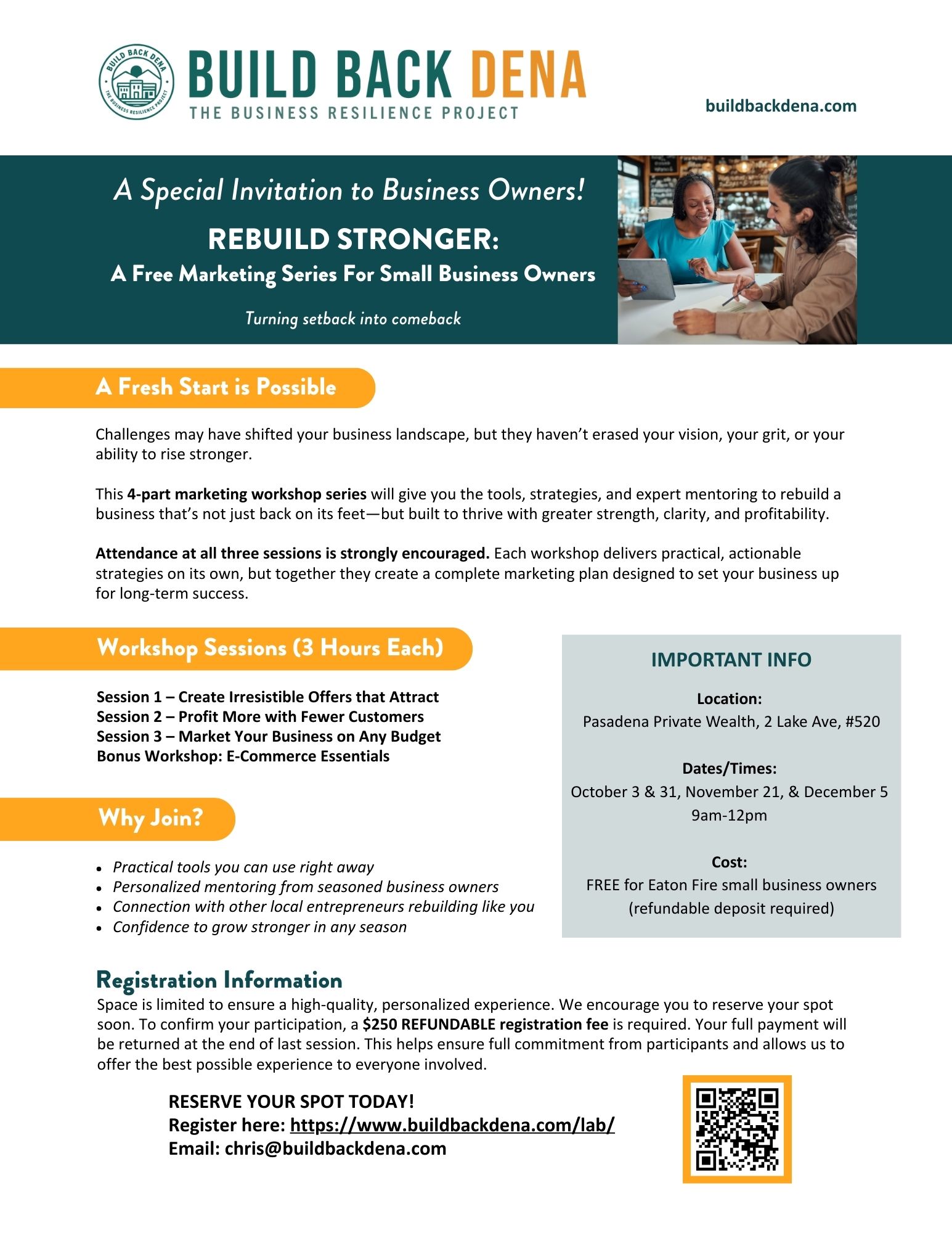 This 4-part marketing workshop series will give you the tools, strategies, and expert mentoring to rebuild a business that's not just back on its feet-but built to thrive with greater strength, clarity, and profitability.