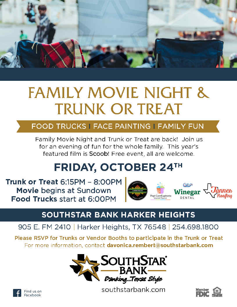 Family Movie Night and Trunk or Treat are back! Get ready for an unforgettable evening of family fun! Dress up in your favorite costumes and join us for: