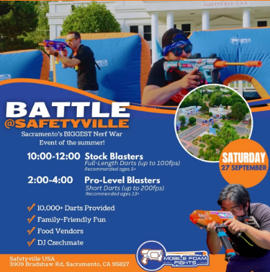We’re hosting a really fun community event - Mobile Foam Fight Battle at Safetyville! Bring your nerf blasters to the biggest nerf battle Sacramento has ever seen. Come join the event with food, family and fun. It’s a family-friendly event that’s expected to bring out hundreds of people.