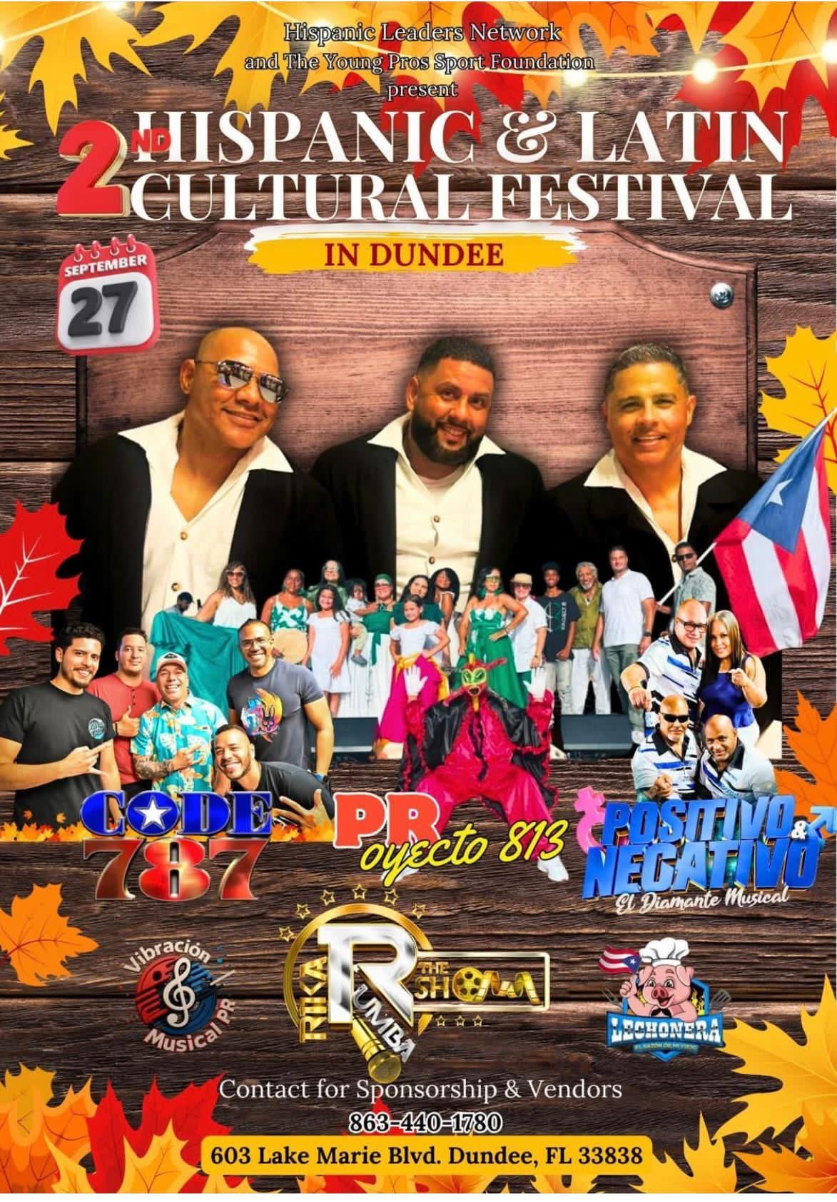 2nd Hispanic & Latin Cultural Festival presented by the Hispanic Leaders Network - Saturday, September 27th, 3 - 8 p.m., Town of Dundee, 603 Lake Marie Blvd., Dundee, FL 33838 - Music, Food, Vendors & More! Contact 863-440-1780 for Sponsorships & Vendors. Click HERE for the flyer.