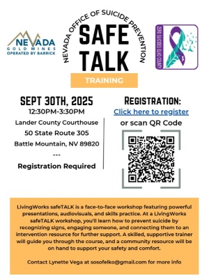LivingWorks safeTALK is a face-to-face workshop featuring powerful presentations, audiovisuals, and skills practice. At a LivingWorks safeTALK workshop, you'll learn how to prevent suicide by recognizing signs, engaging someone, and connecting them to an intervention resource for surther support. A skilled, supportive trainer will guide you through the course, and a community resource will be on hanc to support your safety and comfort. Sponsored by Nevada Gold Mines. Please registrae in advacnce using the QR Code on the attached flyer. Contact Lynette Vega at sosofelko@gmail.com for more info.