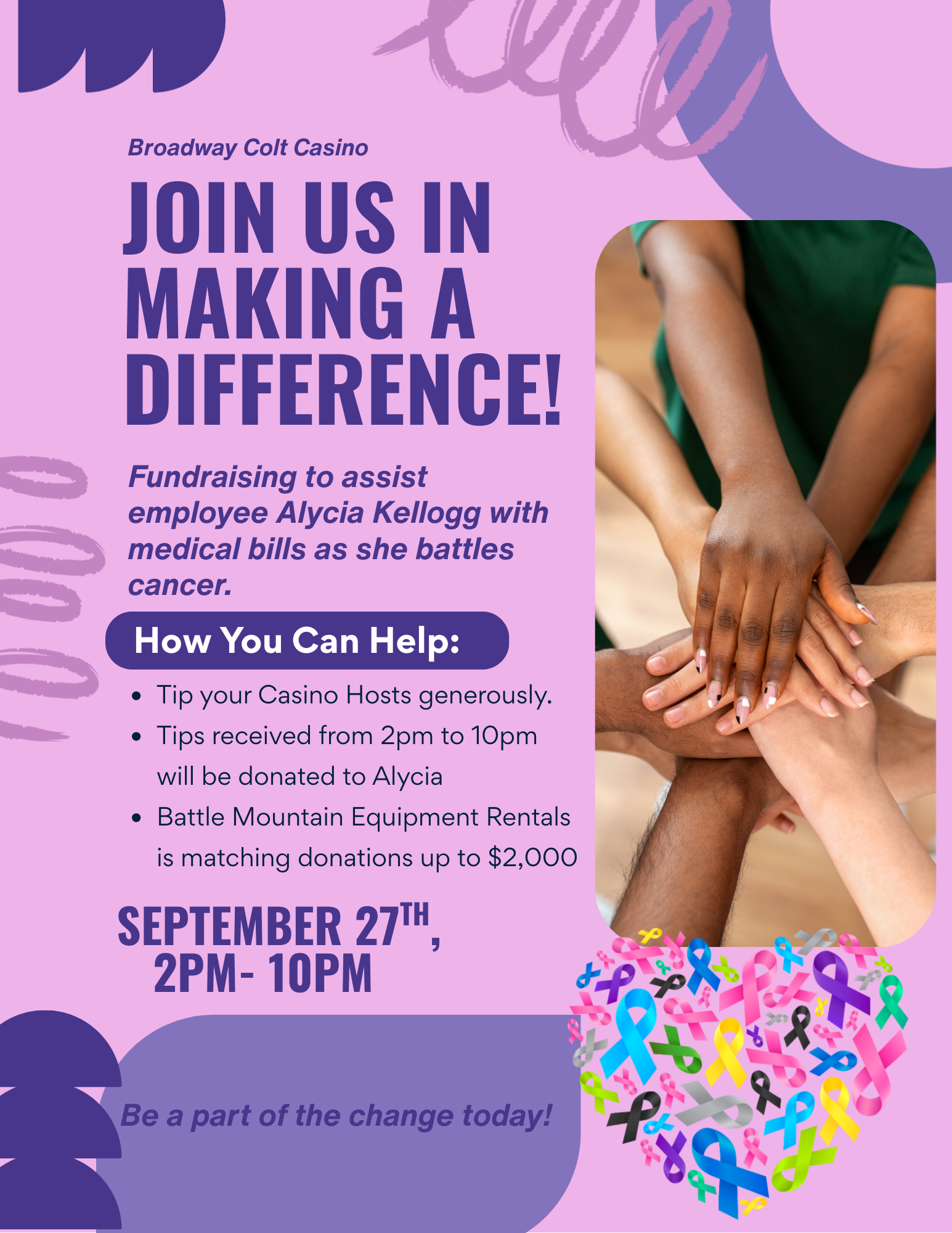Join us at 7pm to see who the lucky person is to win the Kawasaki Teryx KRX 1000. You MUST be present to win. In conjunction with the drawing Casino Hosts will be donating their tips between 2pm and 10pm, to help a Alycia Kellogg, a coworker, with medical bills as she battles cancer. Battle Mountain Equipment Rentals will match tip donations up to $2,000.