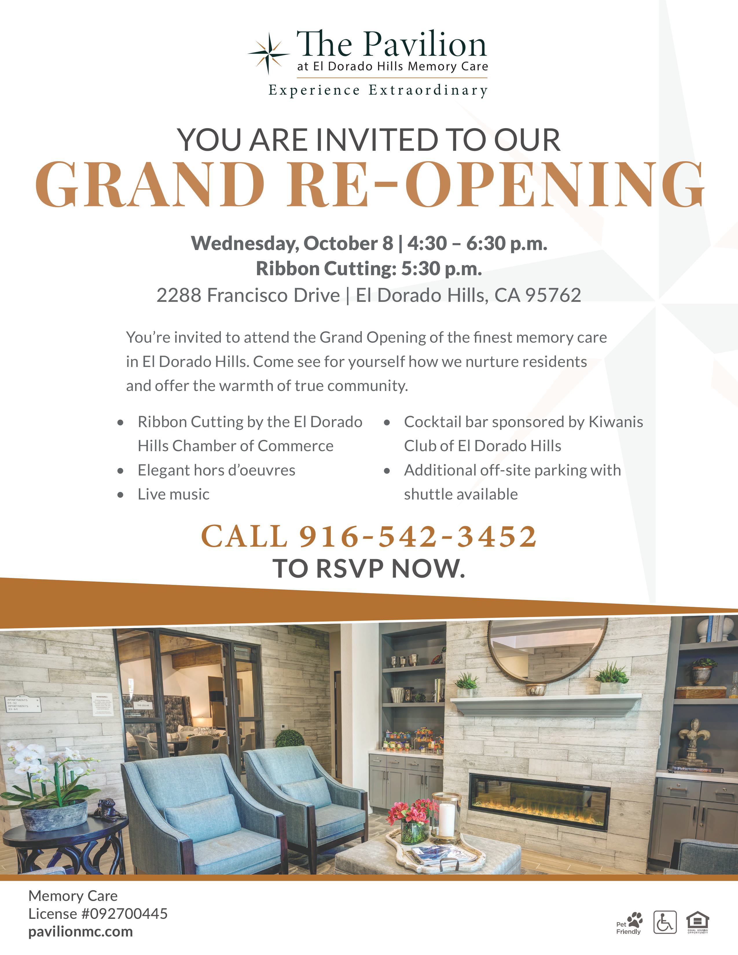 You are all invited to join us at The Pavilion at El Dorado Hills on October 8th for our Grand Re-Opening! The El Dorado Hills Chamber of Commerce has recognized the sizable momentum shift that The Pavilion has taken under new management and has worked with us to reintroduce The Pavilion to our surrounding communities. Come enjoy live music, a ribbon-cutting ceremony, food, and an open bar courtesy of the El Dorado Hills Kiwanis Club.