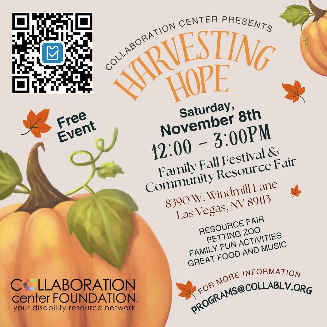 Join the Collaboration Center on November 8th for Harvesting Hope, its 4th Annual Family Fall Festival & Community Resource Fair! This FREE community celebration highlights inclusion and disability awareness while bringing together families, service providers, and community members. Guests can enjoy a lively afternoon filled with a community resource fair, family fun activities, a petting zoo, delicious food, and great music. This annual event is a wonderful way to connect, learn about the many disability resources available in Southern Nevada, and celebrate together in a festive, welcoming atmosphere. For more information, visit https://collablv.org/.
