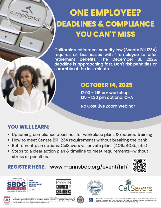 Oct 14 | 12:00pm - 1:30pm I REGISTER HERE: https://www.marinsbdc.org/event/hr1/